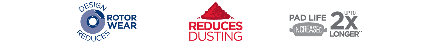 Las fórmulas de fricción patentadas y las formas específicas por vehículo proveen hasta un doble de vida útil de la pastilla, menos suciedad y menos desgaste del disco. El diseño incrementa el flujo de aire turbulento para una disipación mejorada del calor mientras que la forma de la pastilla asegura un desempeño mejorado del ruido, de la vibración y la dureza.